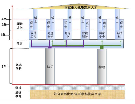 強基計劃遵循“先理后工”的培養(yǎng)思路,即:通過數(shù)學、物理基礎學科專業(yè)招生,采取“3+1+X”本碩博銜接培養(yǎng)模式。其中,“3”是指本科前三年主要以基礎學科專業(yè)課程為主,“1”是指本科第四年進入相關領域(如下圖)學習,通過項目驅動完成專業(yè)基礎和選修課程;碩士、博士研究生階段可分流至相關領域的相應專業(yè)進行學習研究工作,“X=2”是指本碩銜接,碩士階段2年,“X=4”是指本碩博銜接,碩博階段4年(具體畢業(yè)年限視研究進展和論文完成情況確定)。