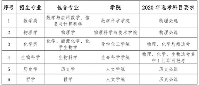 聚焦國家關(guān)鍵領(lǐng)域以及人才緊缺領(lǐng)域,突出基礎(chǔ)學(xué)科支撐引領(lǐng),結(jié)合學(xué)校國家一流建設(shè)學(xué)科、基礎(chǔ)學(xué)科拔尖學(xué)生培養(yǎng)計劃2.0以及學(xué)校優(yōu)勢學(xué)科,在數(shù)學(xué)類、物理學(xué)、化學(xué)類、生物科學(xué)、歷史學(xué)、哲學(xué)等6個專業(yè)進(jìn)行招生。具體招生專業(yè)情況及高考綜合改革省份選考科目要求詳見附件。