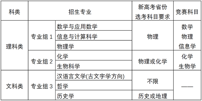 我校強(qiáng)基計劃設(shè)三個專業(yè)組8個專業(yè),分別是數(shù)學(xué)與應(yīng)用數(shù)學(xué)、信息與計算科學(xué)、物理學(xué)、化學(xué)、生物科學(xué)、漢語言文學(xué)(古文字學(xué)方向)、歷史學(xué)、哲學(xué)。招生總計劃為210人,分省計劃見報名系統(tǒng)。實(shí)施新高考省份的第一類和第二類考生選考科目均應(yīng)符合填報專業(yè)的科目要求。